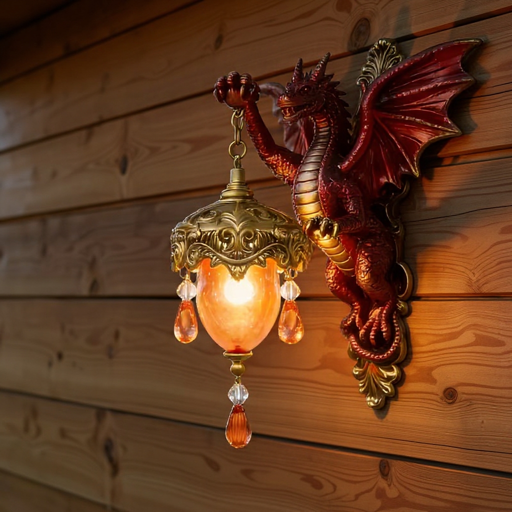 Softly glowing beneath the dragon’s watch, this wall lantern brings warmth and quiet drama to your space. The rich crimson wings, sculpted details, and amber light create a feeling that’s bold — yet inviting. It’s not just lighting. It’s atmosphere.